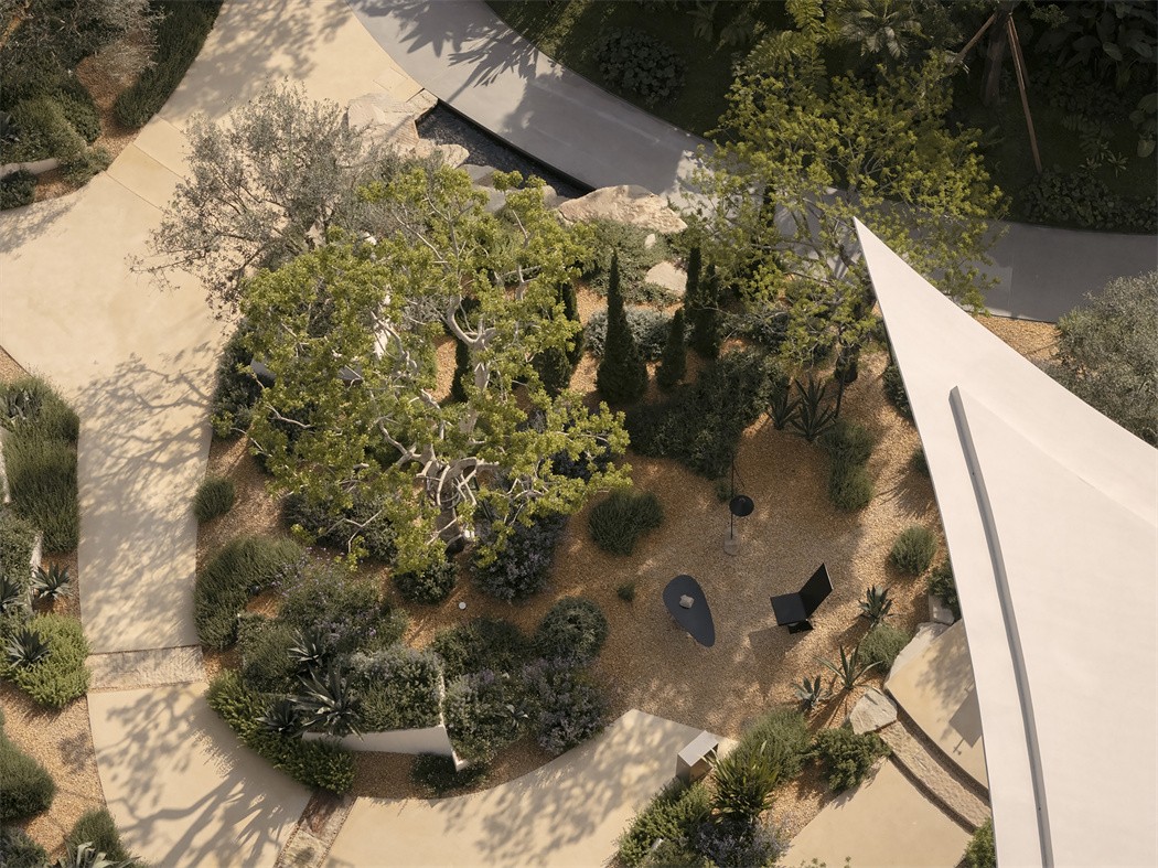 通过接纳“天涯花环”设计——以桁架为整体结构,上部块面接纳镜面表皮,将花境植被的生气延伸至半空,似乎将自然之美托举向天涯;下部则以翻转形态形成二次反射,消弭了桁架柱梁的厚重感,使其如悬浮于修建之上的艺术精灵,灵动而富有张力。